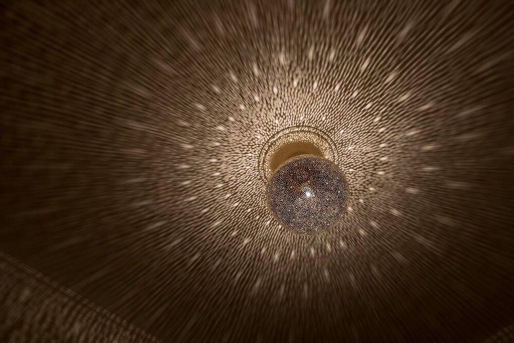 Taklampa i bollform . Mycket trevlig boll av mässing . Lampan är helt gjord för hand. Genom perforerings resultat på väggen och taket, ett mönster som påminner om sanddyner. Lampan är också effektivt modernt trots din orientaliska ursprung
