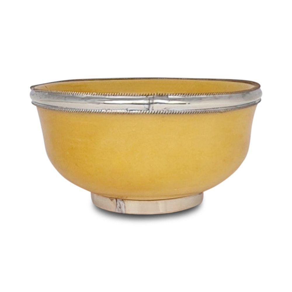 Vackra skålar och fat i porslin med silverkant. De är handgjorda i Marocko och helt unika, och kan därför skilja i färg. Denna produkt ska diskas för hand. Skålarna passar utmärkt till sallad, frukt mm.
